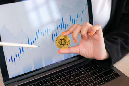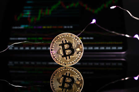 Bitcoin Stock Growth. Chart shows a strong increase in the price of bitcoin. Bitcoin gold coin and defocused chart background. Virtual cryptocurrency concept.