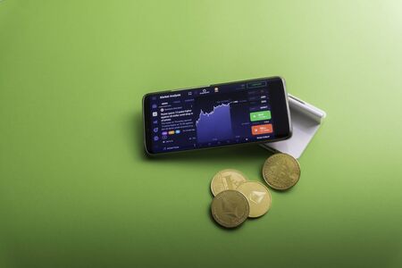 A man analyzes the rate of bitcoin in a mobile application. Smartphone with mobile application cryptocurrency wallet. The concept of cryptocurrency trading