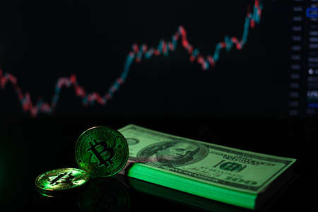 a bitcoin coin lies next to the pile of banknotes and in the background is a rising bitcoin chart