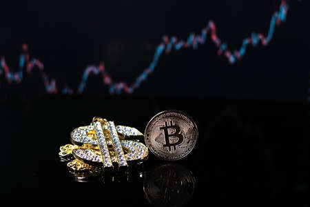 one bitcoin coin lies next to a diamond studded dollar chain pendant