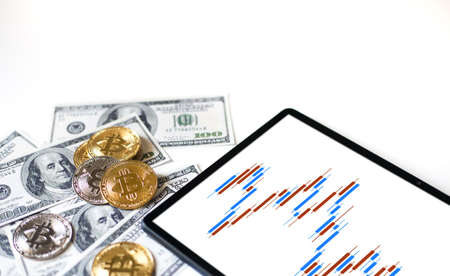 Focus on golden coin with silver coin and dollar, Digital tablet with graph on screen on white background. Concept invest in cryptocurrency