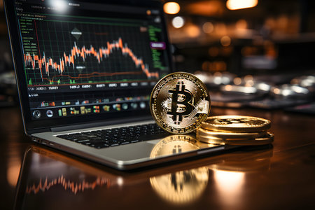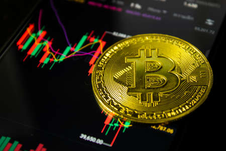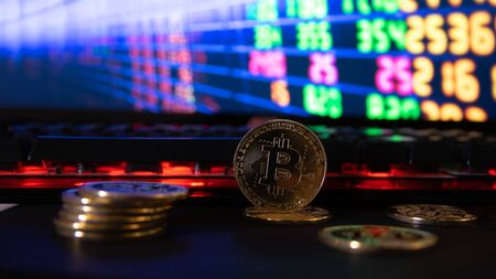 Coin Bitcoin on background cryptocurrency trading chart on computer screen. Digital money, banking, investment, finance and business concept