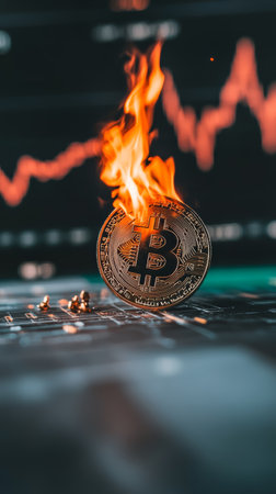 Gold bitcoin coin burning in flames symbolizing cryptocurrency market crash or volatility against backdrop of stock market charts displayed on computer screen