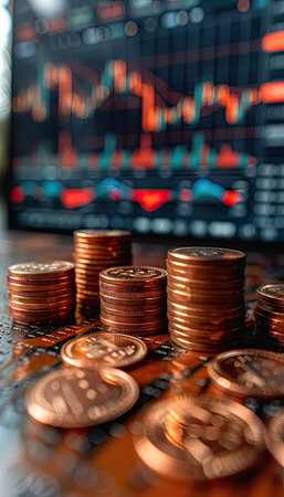 A cluster of coins is arranged on a wooden table next to a graph showing stock prices