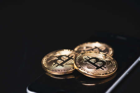 Golden Bitcoins pile on smartphone with black background. Blockchain and digital crypto currency exchange concept.