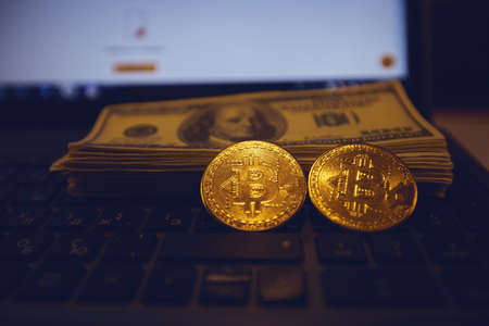 Golden symbolic coin Bitcoin on banknotes of one hundred dollars. Exchange bitcoin cash for a dollars. Cryptocurrency on US dollar bills.