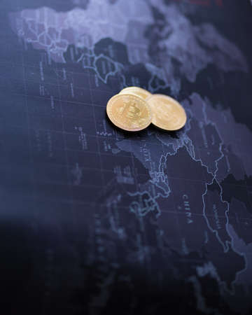 Cryptocurrency coin gold on blurred map world background,