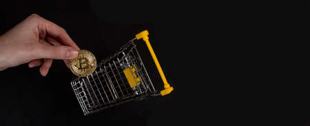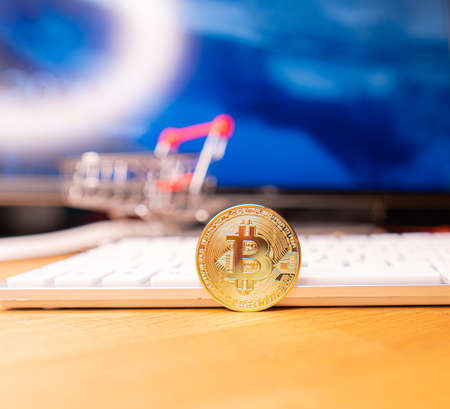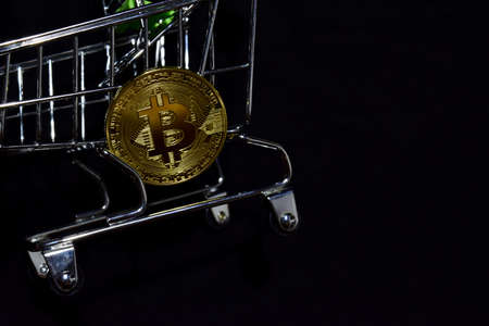 Coin of the cryptocurrency bitcoin in a basket from a supermarket against the background computer