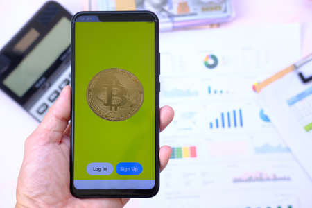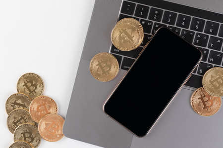 smartphone, bitcoin on laptop computer