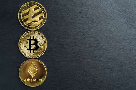 Physical Bitcoin, Litecoin and Ethereum gold coins on a black stone slate plate background. Cryptocurrency. Copy space on the right.