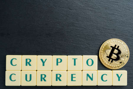 Physical Bitcoin gold coin with text made out of letter tiles. Cryptocurrency. Copy space in the top.