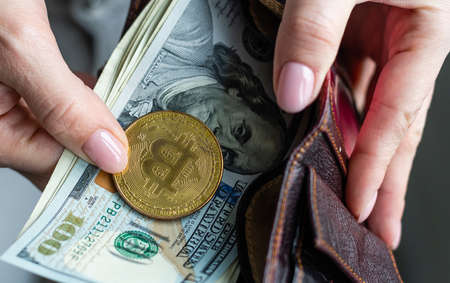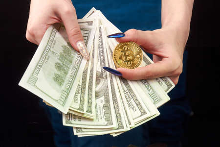 Close-up womans hands hold money and bitcoin.