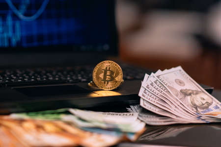 Bitcoin on a home computer chart and money and investment