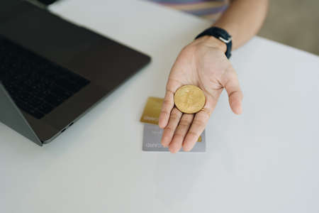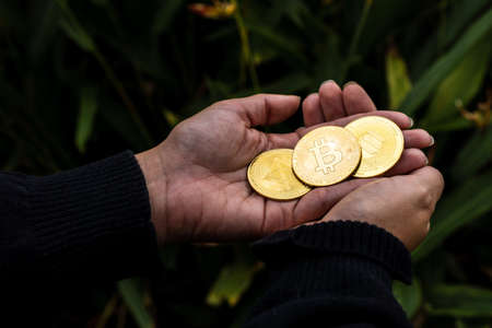 Cryptocurrency is digital currency, women hold their hands on computer ready bitcoin coins to invest assets from the digital or imaginary world of the future. , finance, investment, risk management.