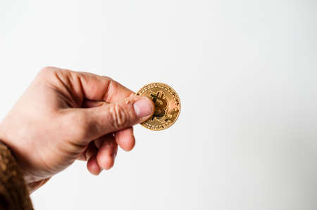 bitcoin electronic coin holding in the hand white background