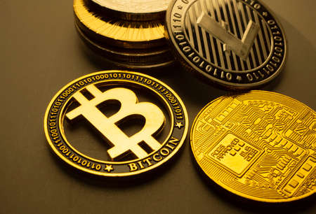 Conceptual image of different cryptocurrency with bitcoins on dark table, close-up, selective focus, front focus, shallow depth of field. Cryptocurrency concept. Physical bit coin. Digital currency. Cryptocurrency. Golden coin with bitcoin symbol.