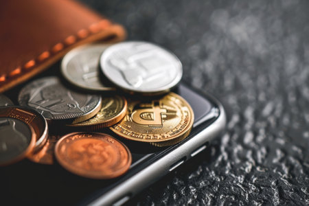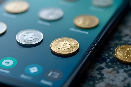 golden bitcoin coins on a smartphone, representing the electronic currency