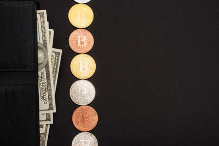 KYIV, UKRAINE - APRIL 26, 2022: Top view of wallet with dollars and crypto coins isolated on black