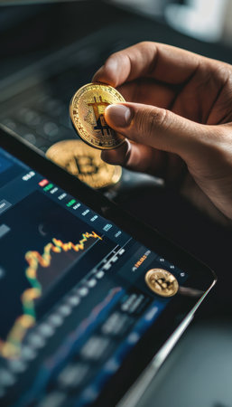 Cryptocurrency Investment Concept: Golden Coin and Digital Trading App Interface in Corporate Setting