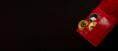 Shiny golden bitcoin and Ethereum silver coin, litecoin in red wallet pockets on black background. New currency concept, top view.