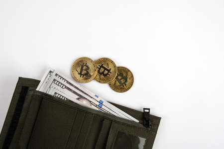 Green wallet with dollar banknotes and bitcoin coins on a white background. Copy space