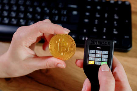 Close up womans hand holding bitcoin and cryptocurrence hardware cold wallet on keybord background. Secure cryptocurrency storage.
