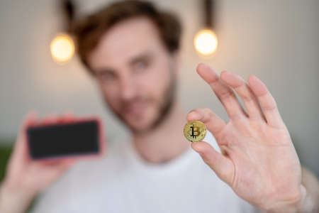 Young bearded man holding a bitcoin in his hand