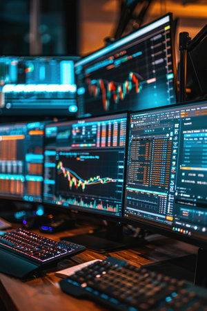 Financial trading data is meticulously analyzed across multiple computer screens in a dark, modern office setting.