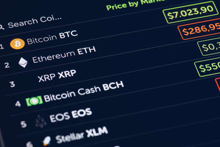 Crypto Currency market concept. Bank market and virtual currency value graph. Statistics comparison of best-selling crypto coins on stock exchange. Use for Bitcoin, ETH, Ripple, Bitcoin cash.
