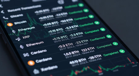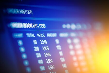 Shallow depth of field footage with details of Bitcoin cryptocurrency price fluctuations on a crypto exchange app, on a digital screen.