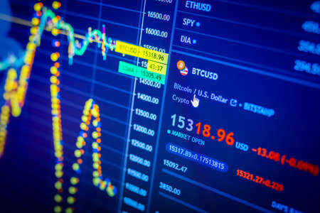 Cryptocurrency exchange chart. Bitcoin price goes up to 60 000 dollars. Blockchain and digital money