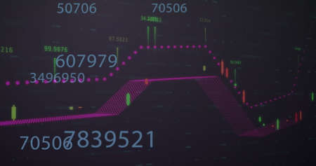 A close-up view presents a digital stock market chart with colorful data points and lines. The image displays complex financial information against a dark background, showcasing business and economic trends. This graphic can be used for presentations related to investment, trading, and market analysis.