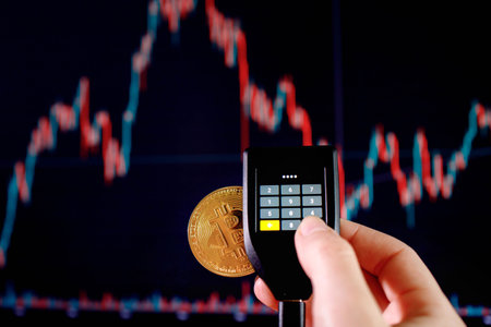 Close up womans hand holding bitcoin and enter the password on cryptocurrencey hardware cold wallet on stock market graph background. Secure cryptocurrency storage.