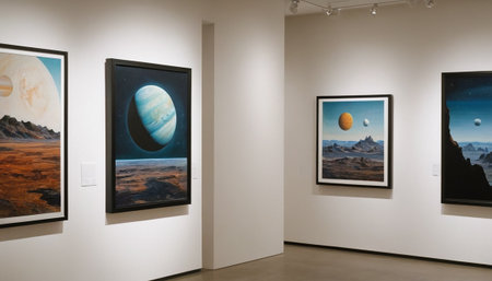 Interior of modern art gallery with pictures of planets, stars and galaxies