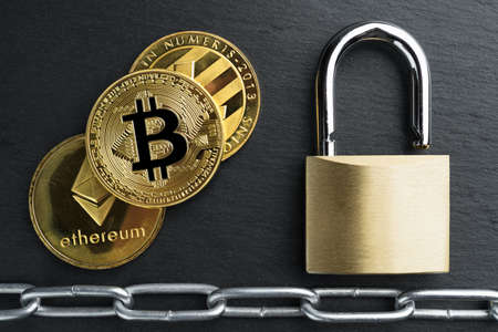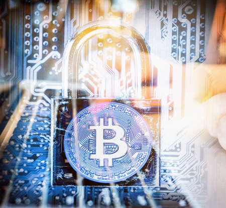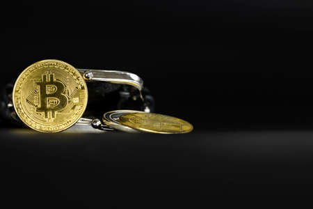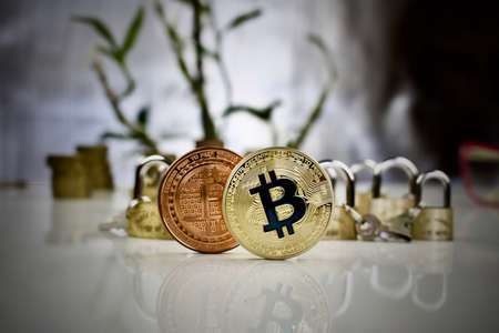 Bitcoins coins and closed padlock. Secure your cryptocurrencies