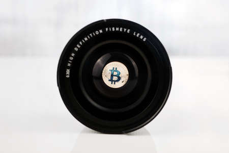 Cryptocurrency physical bitcoin coin in fisheye lenses