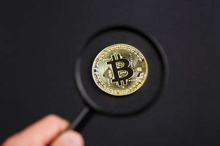 coin bitcoin under a magnifying glass on a dark background, extraction of crypto currency