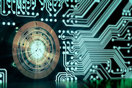 Cyber security concept. Fingerprint and safe as an idea to counteract hacking computers and smartphones or tablets as well as an idea for a network firewall