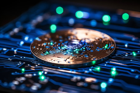 close-up of gold bitcoin on computer components background, technology and digital currency concept