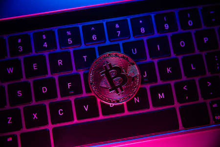 Bitcoin coin symbol on keyboard. Top view. Future financial currency concept