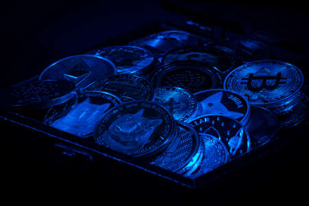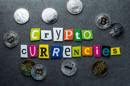 Crypto currency background with various of shiny silver and golden physical cryptocurrencies symbol coins, Bitcoin, Ethereum, Litecoin, zcash, ripple.