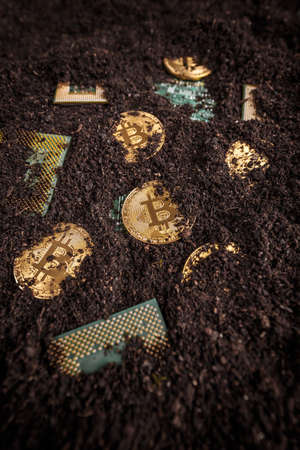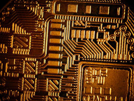 Virtual cryptocurrency money Bitcoin golden coin on Machine controller plates of car part. The future of money. Computational equipment. Blue mother board. Shot directly from above.