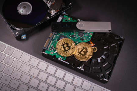 two bitcoin coins are on a hard drive next to a hardware wallet and keyboard
