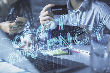 Double exposure of man and woman on-line shopping holding a credit card and crypto theme hologram drawing. Blockchain and E-commerce pay on-line concept.