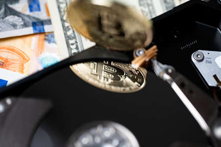 Bitcoin coin on hard drive reflecting coins on shiny platter. Euro and dollar banknotes in the background. Storage, mining and exchange of cryptocurrency, concept.