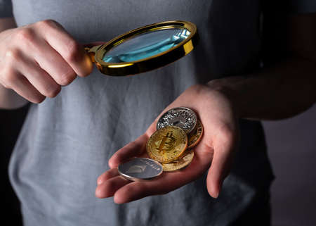 Shiny gold and silver coins of crypto currency in female hand palm with magnifying loupe close up. Pile of bitcoin and other cryptocurrency.