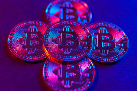 The coins of Bitcoin are on a dark Surface. Purple and pink neon light