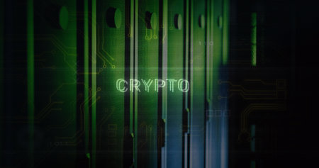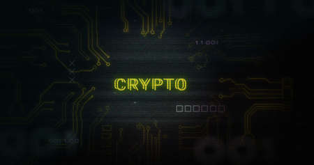 Image of interference over crypto text, data processing and computer circuit board. global technology, computing and digital interface concept digitally generated image.