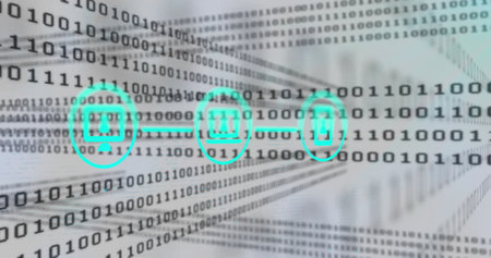 Image of connections with icons, digital data processing over binary coding. Global connections, computing and data processing concept digitally generated image.