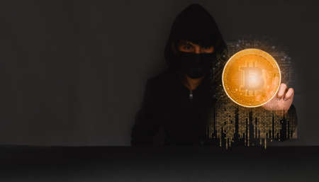 Dangerous hooded hacker on laptop breaks computer security sistem and steal bitcoin cryptocurrency